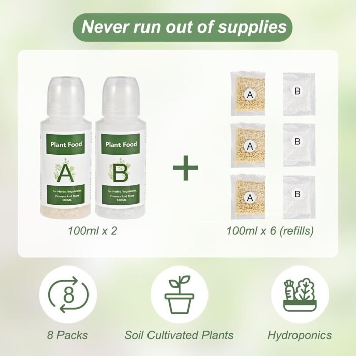 - Complete Nutrient Solution: Includes two bottles and six packs of A&B nutrients, providing all essential elements for plant health.